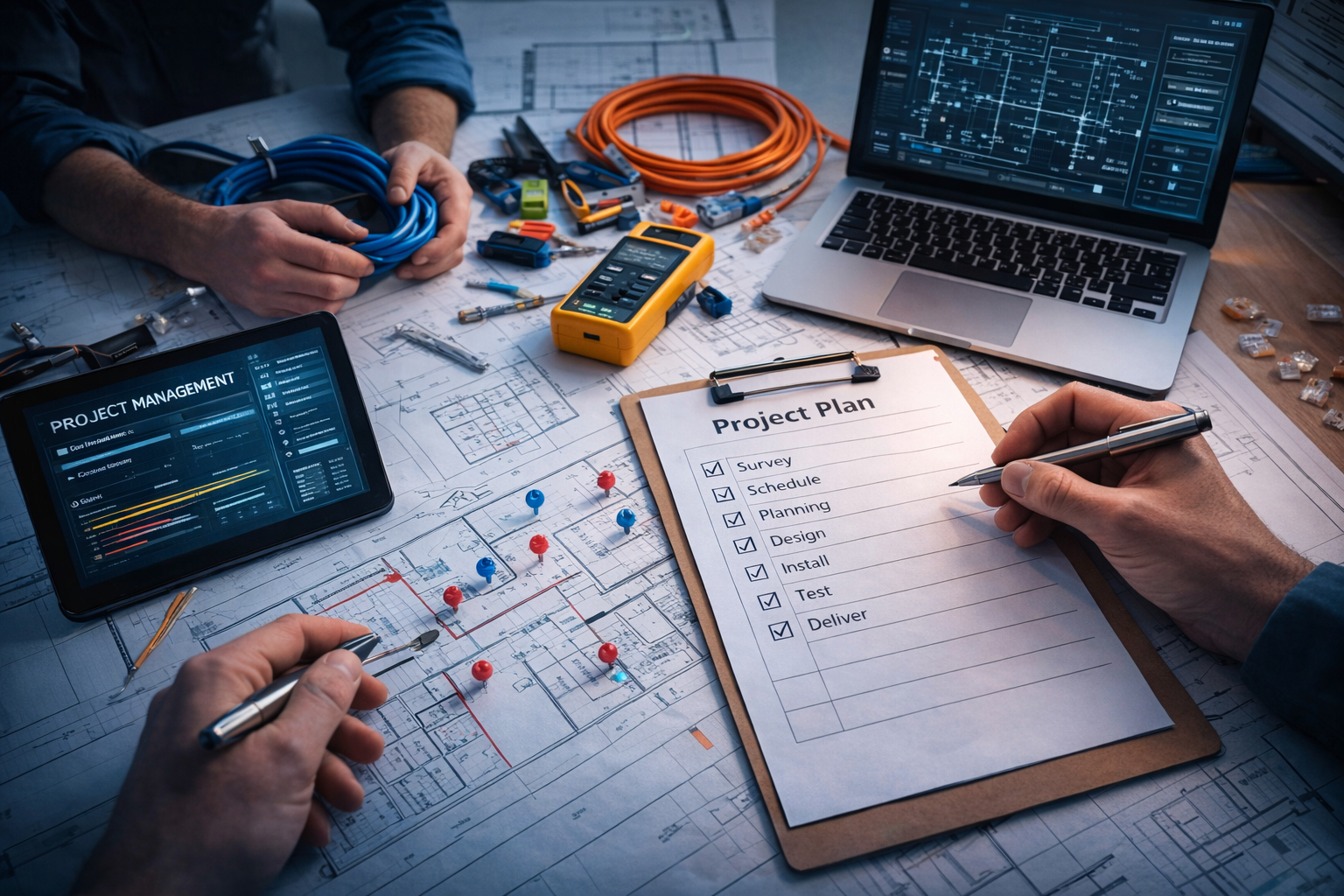 Obyekt baxışı, planlama, kabel marşrutu, montaj və test.